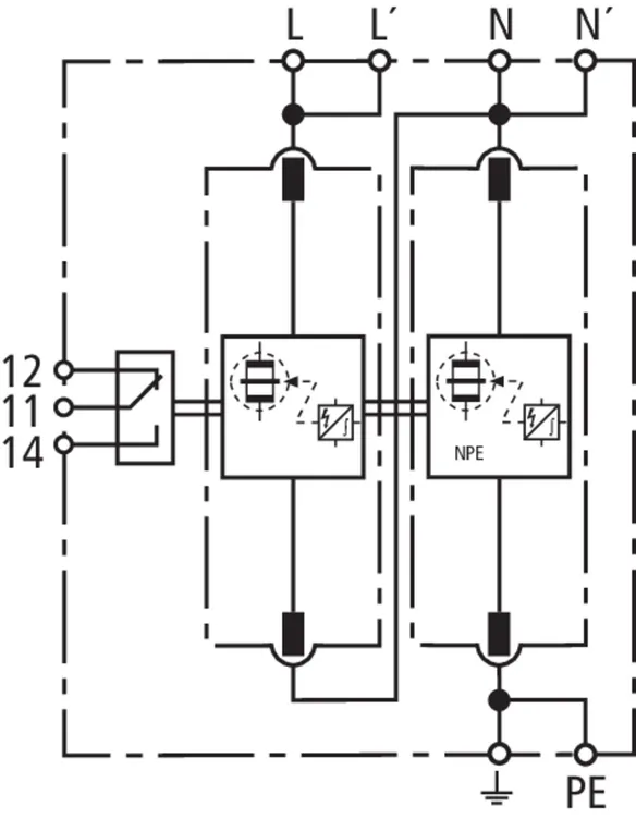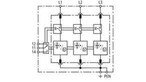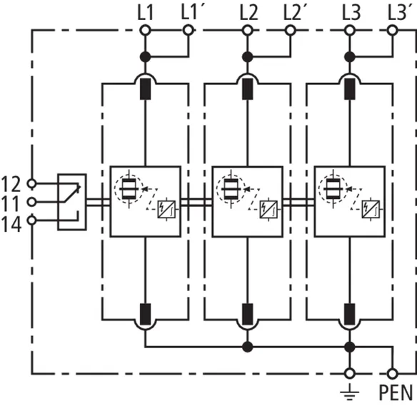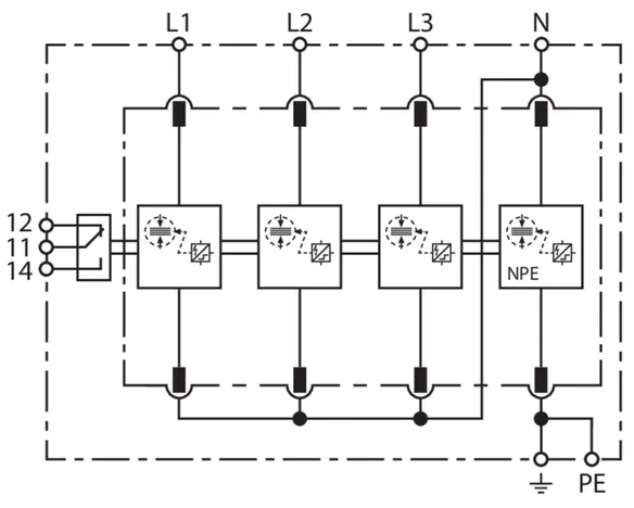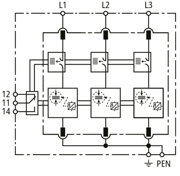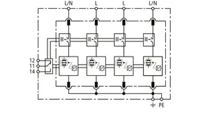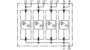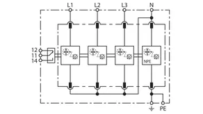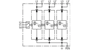Modulární kombinovaný svodič pro sítě TN-S 230/400 V (zapojení 4+0); v provedení FM s bezpotenciálovým kontaktem dálkové signalizace.