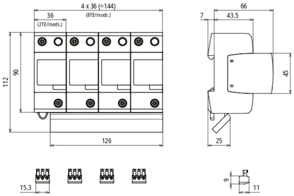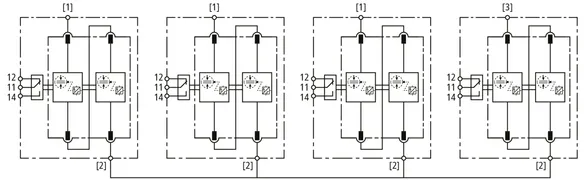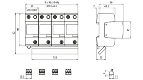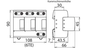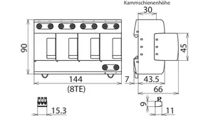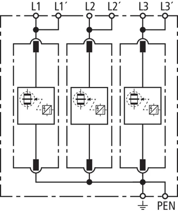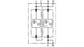 • Kompletně zapojený kombinovaný svodič typ 1 + typ 2 + typ 3 na bázi jiskřiště, složený ze základního dílu a jednoho zásuvného ochranného modulu