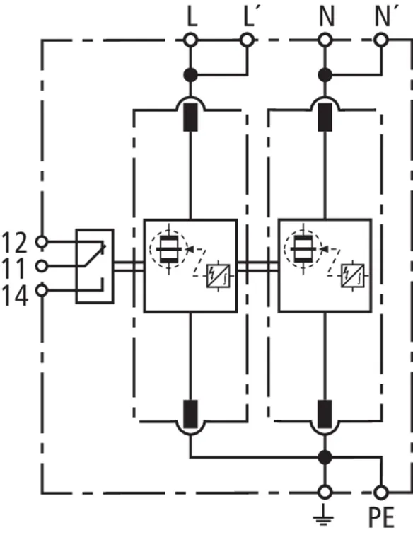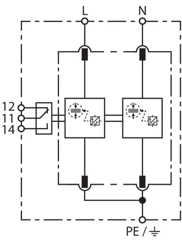 Modulární kombinovaný svodič pro jednofázové sítě TT a TN-S 230 V (zapojení 1+1); v provedení FM s bezpotenciálovým kontaktem dálkové signalizace.