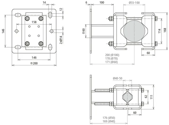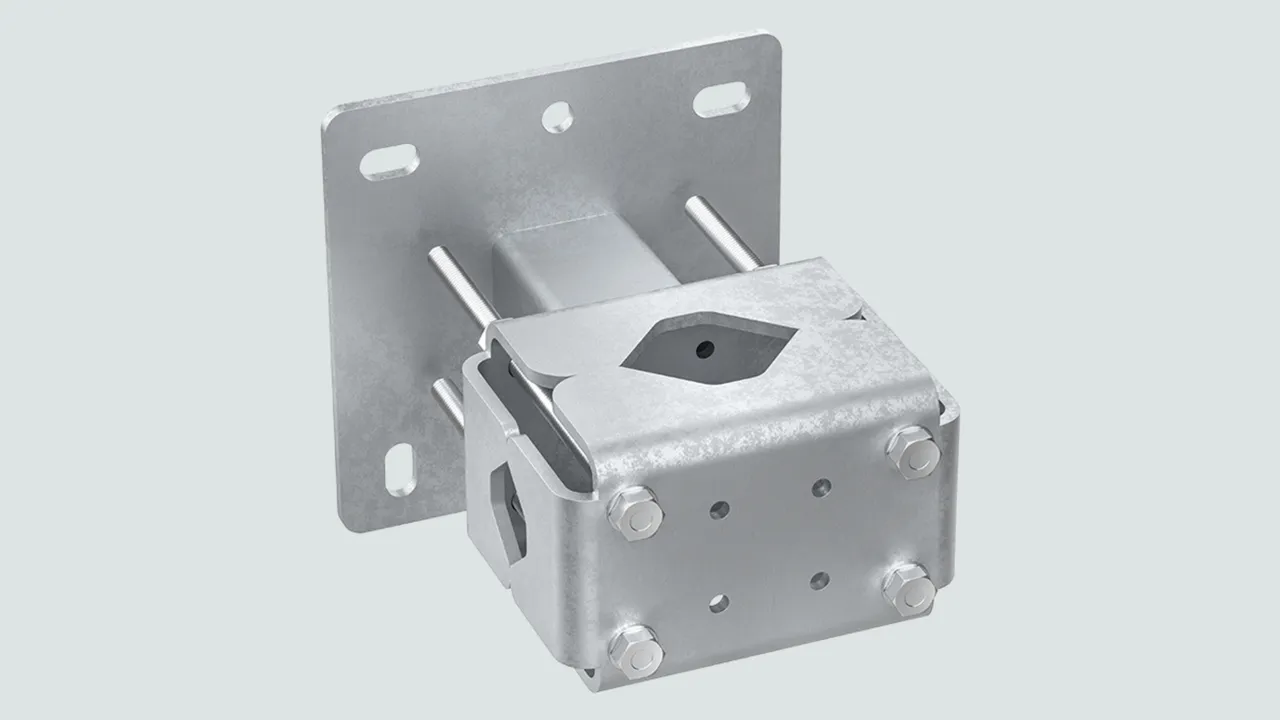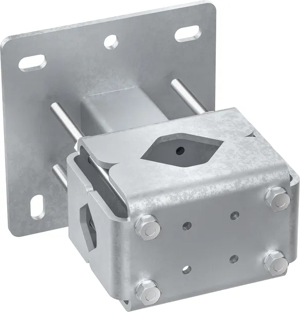 Držák stožáru v těžkém provedení lze použít k uchycení jímacích stožárů o průměru Ø 40–50 mm (svisle) a Ø 55–100 mm (vodorovně).