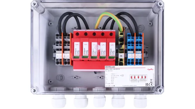 Napájecí vedení 230/400 V: Jednopólový kombinovaný svodič DEHNvenCI, typ 1 + typ 2 podle EN 61643-11 na bázi jiskřiště s integrovaným předjištěním schopným převést bleskové proudy.