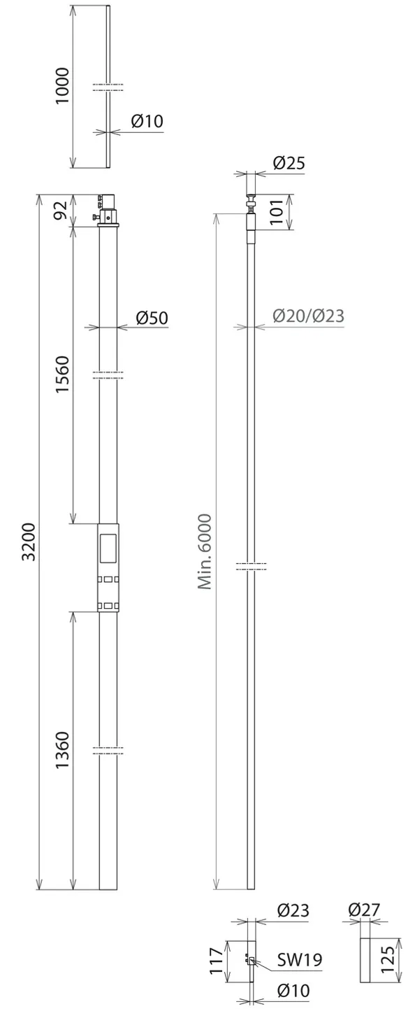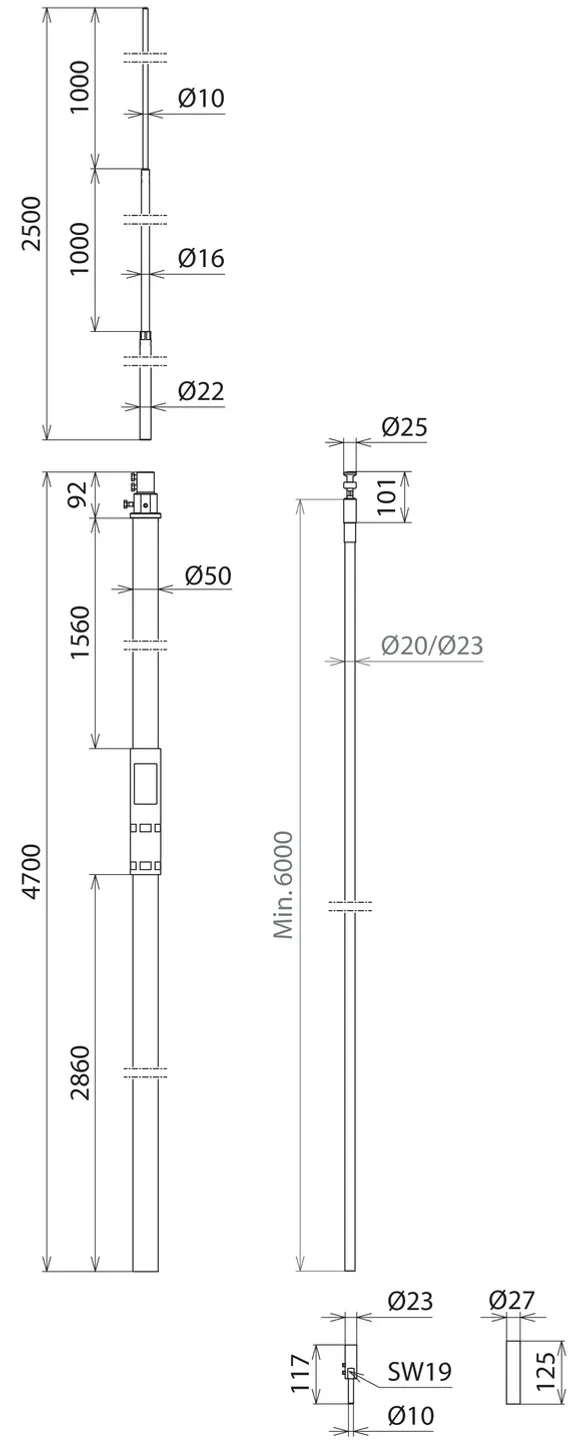 | Max. volná délka s jímací tyčí (montáž na stěnu) | 5500 mm |