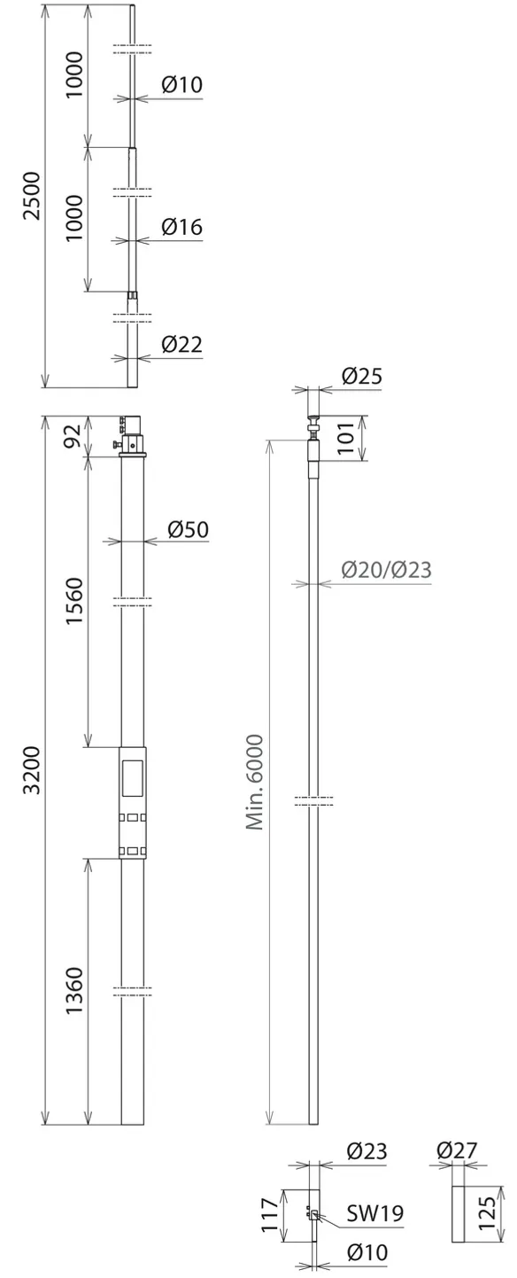 | Max. volná délka s jímací tyčí (montáž na stěnu) | 3500 mm |