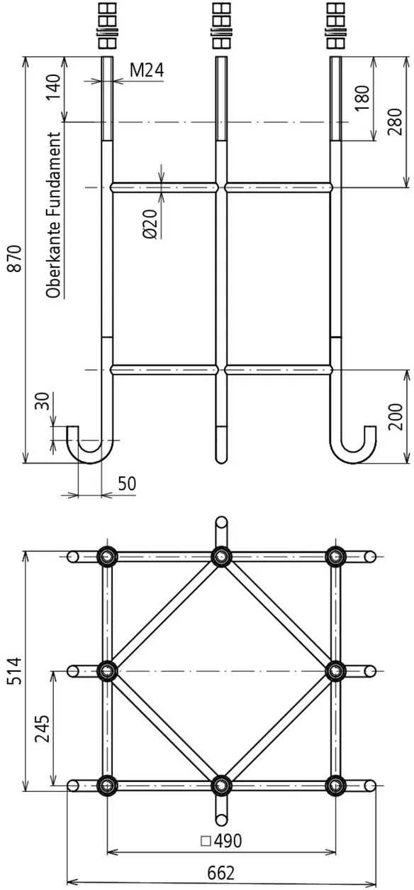 | Provedení svorníků se závity | 8x M24 (490 x 490 mm) |