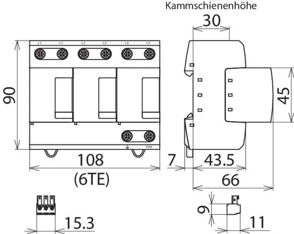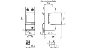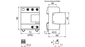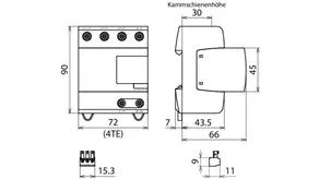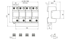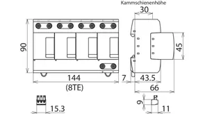 - Kompletně zapojený kombinovaný svodič typ 1 + typ 2 + typ 3 na bázi jiskřiště, složený ze základního dílu a jednoho zásuvného ochranného modulu