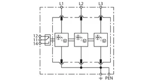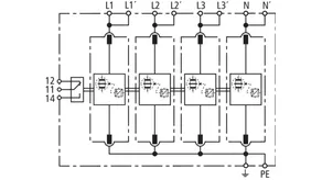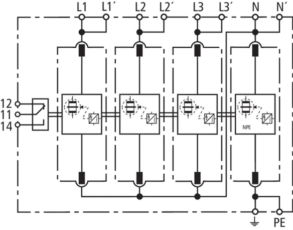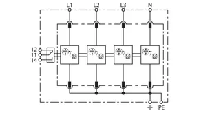 Modulární kombinovaný svodič pro sítě TN-S 230/400 V (zapojení 4+0); v provedení FM s bezpotenciálovým kontaktem dálkové signalizace.