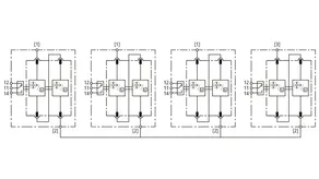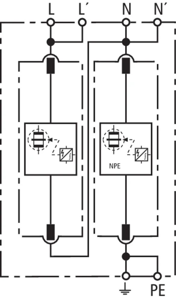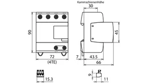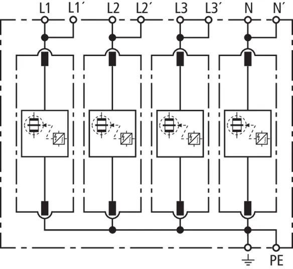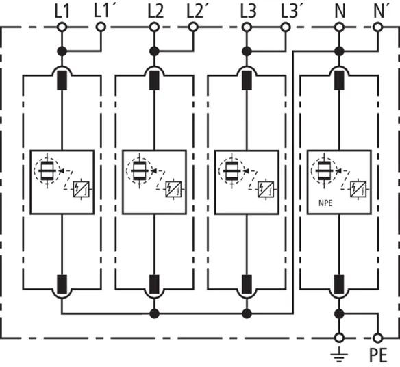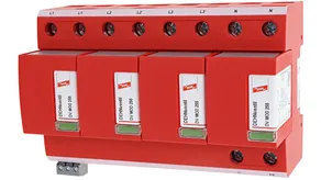 • Kompletně zapojený kombinovaný svodič typ 1 + typ 2 + typ 3 na bázi jiskřiště, složený ze základního dílu a jednoho zásuvného ochranného modulu