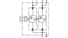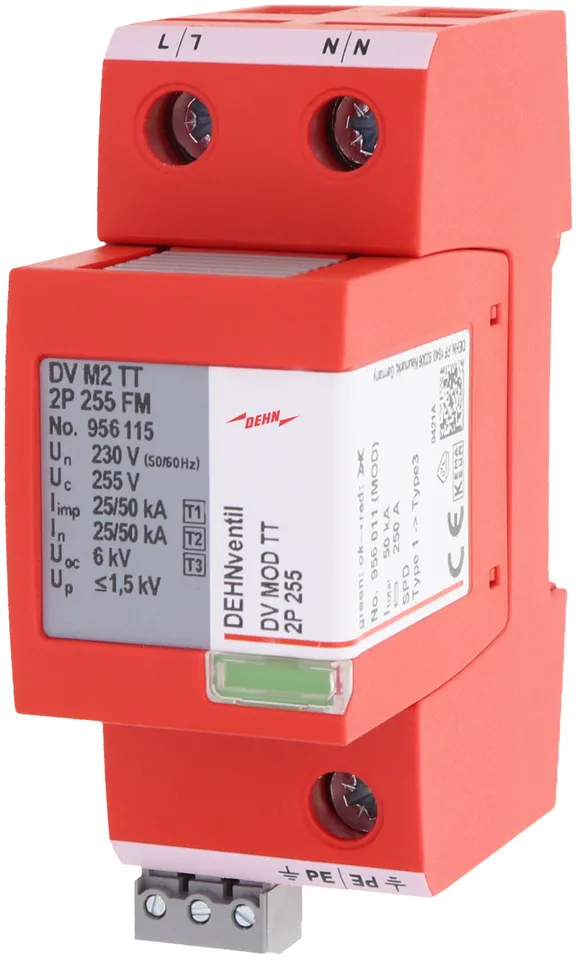 Modulární kombinovaný svodič pro jednofázové sítě TT a TN-S 230 V (zapojení 1+1); v provedení FM s bezpotenciálovým kontaktem dálkové signalizace.
