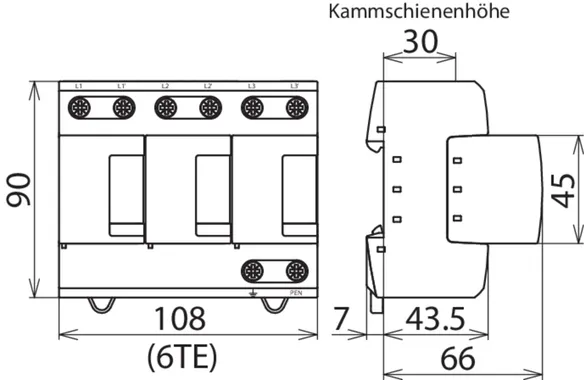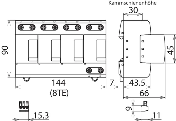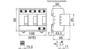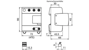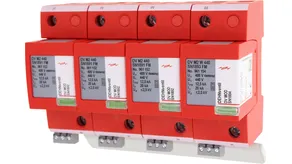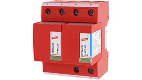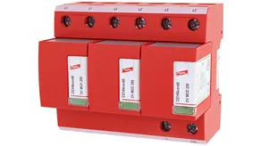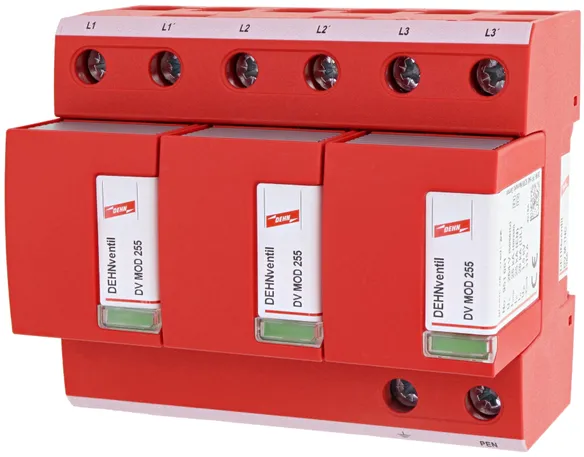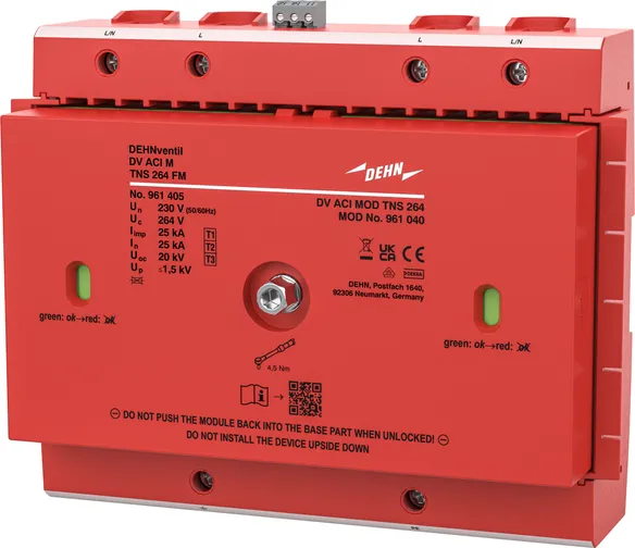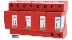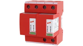 - Kompletně zapojený kombinovaný svodič typ 1 + typ 2 + typ 3 na bázi jiskřiště, složený ze základního dílu a jednoho zásuvného ochranného modulu