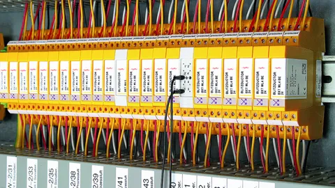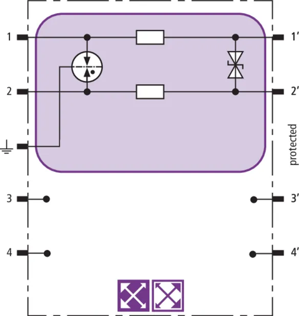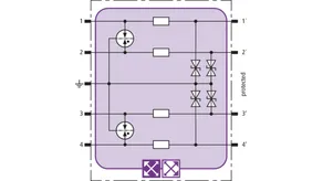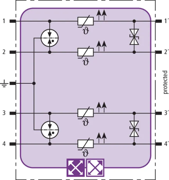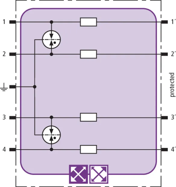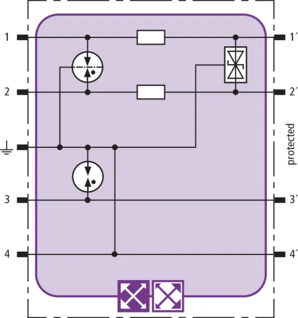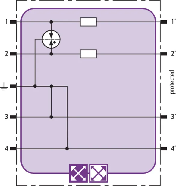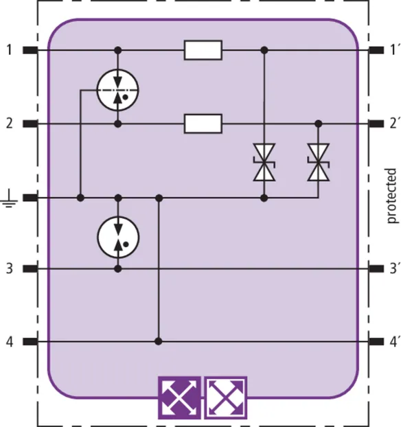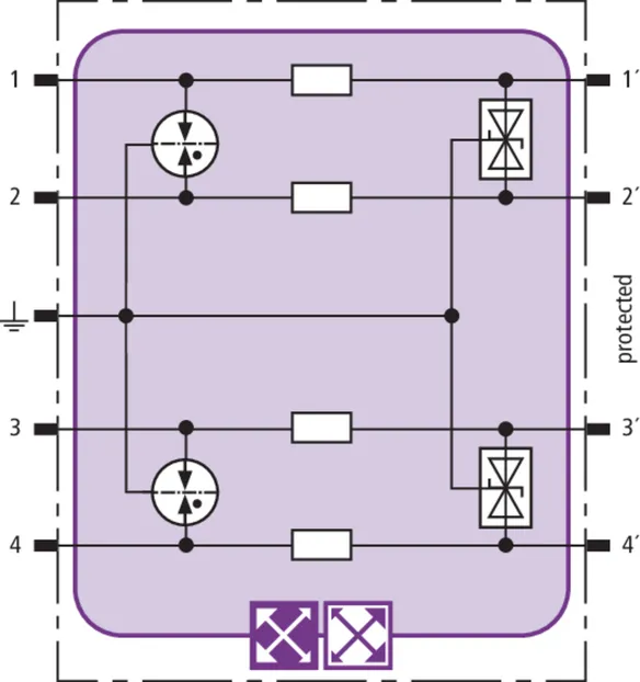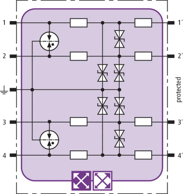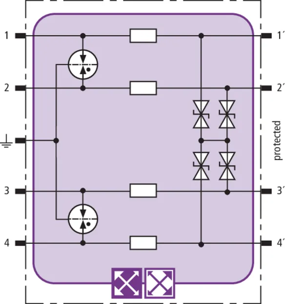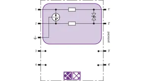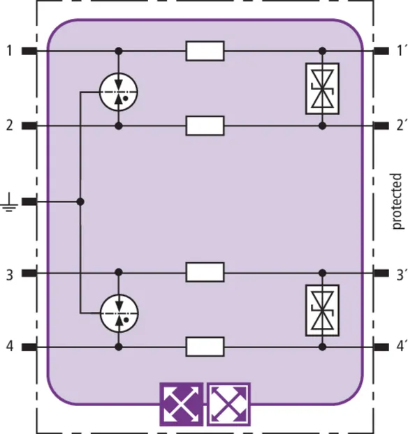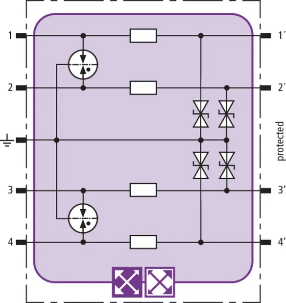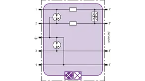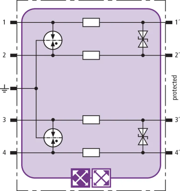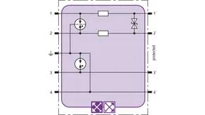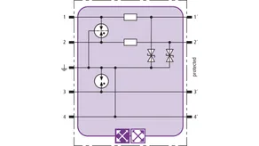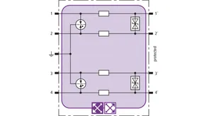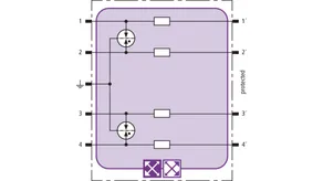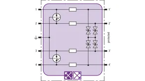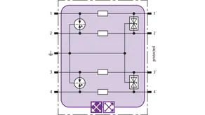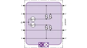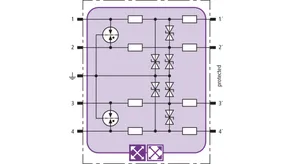 Prostorově úsporný modul kombinovaného svodiče s čipem RFID-LifeCheck chrání 2 páry vedení v systémech 24 V DC. Použití rovněž v obvodech s uzemněným mínusovým pólem. Integrovaná nadproudová ochrana umožňuje bezpečné vyresetování svodiče po průchodu zkratového proudu až 40 A.