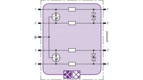 Prostorově úsporný modul kombinovaného svodiče s čipem RFID-LifeCheck chrání 2 páry žil neuzemněného symetrického rozhraní. LifeCheck zaznamenává tepelné nebo elektrické přetížení svodiče, po kterém je třeba svodič vyměnit. Kontrola je prováděna bezdotykově prostřednictvím přístrojů DEHNrecord LC / SCM / MCM.