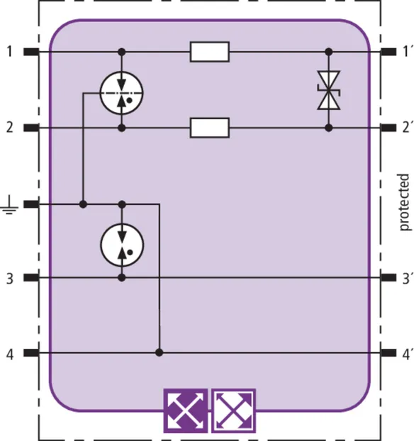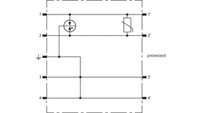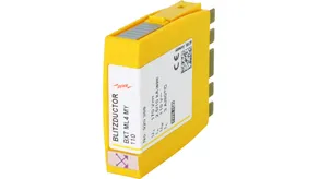Prostorově úsporný modul kombinovaného svodiče s čipem RFID-LifeCheck chrání 4 samostatné žíly se společným vztažným potenciálem a nesymetrická rozhraní. LifeCheck zaznamenává tepelné nebo elektrické přetížení svodiče, po kterém je třeba svodič vyměnit. Kontrola je prováděna bezdotykově prostřednictvím přístrojů DEHNrecord LC / SCM / MCM.