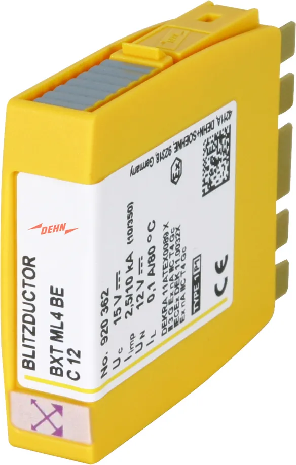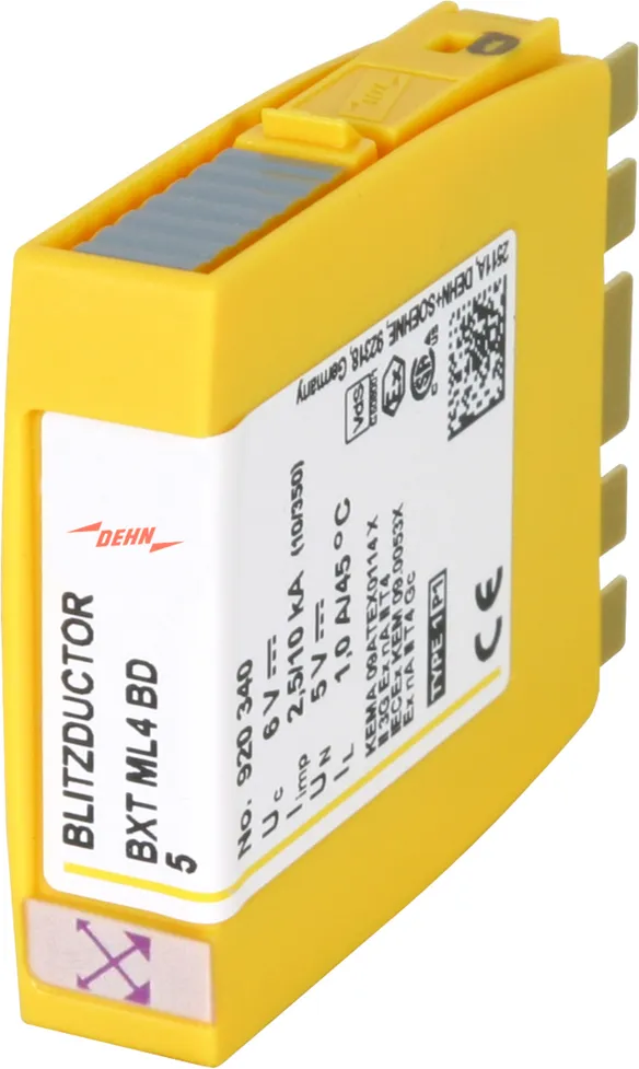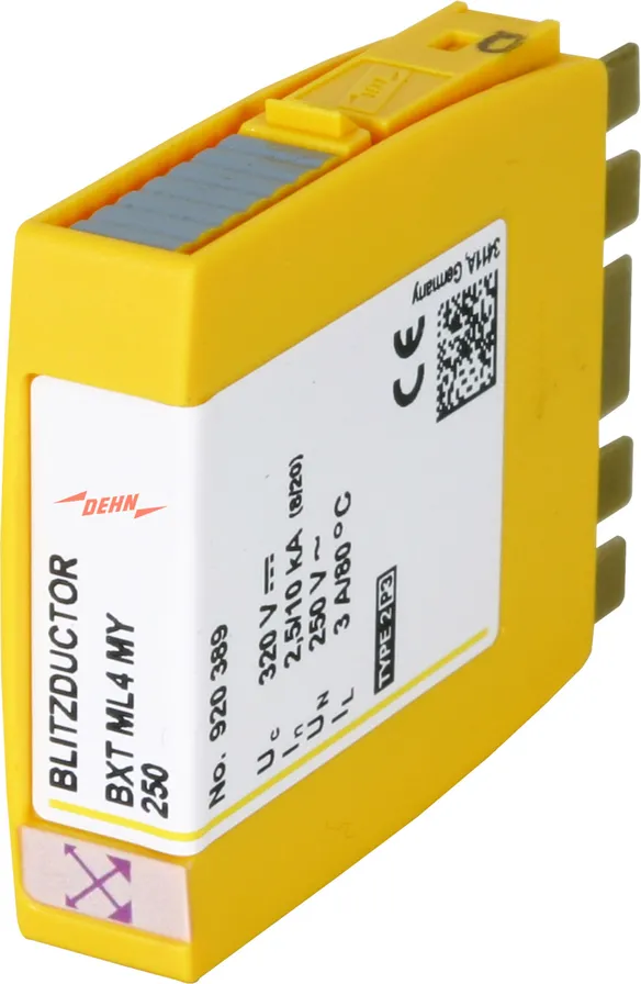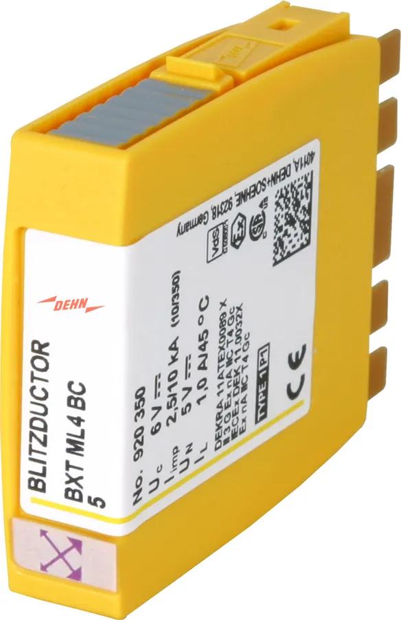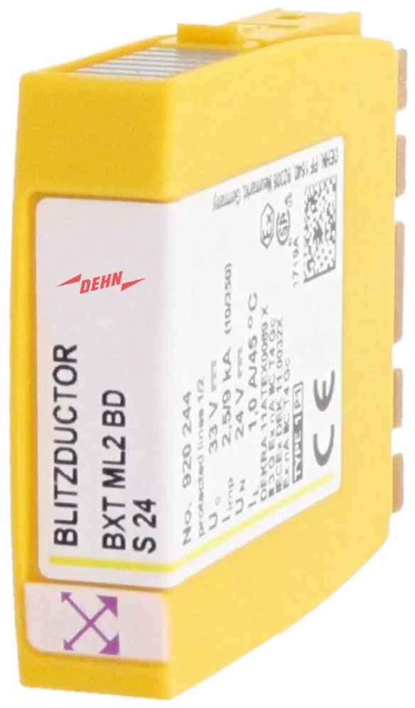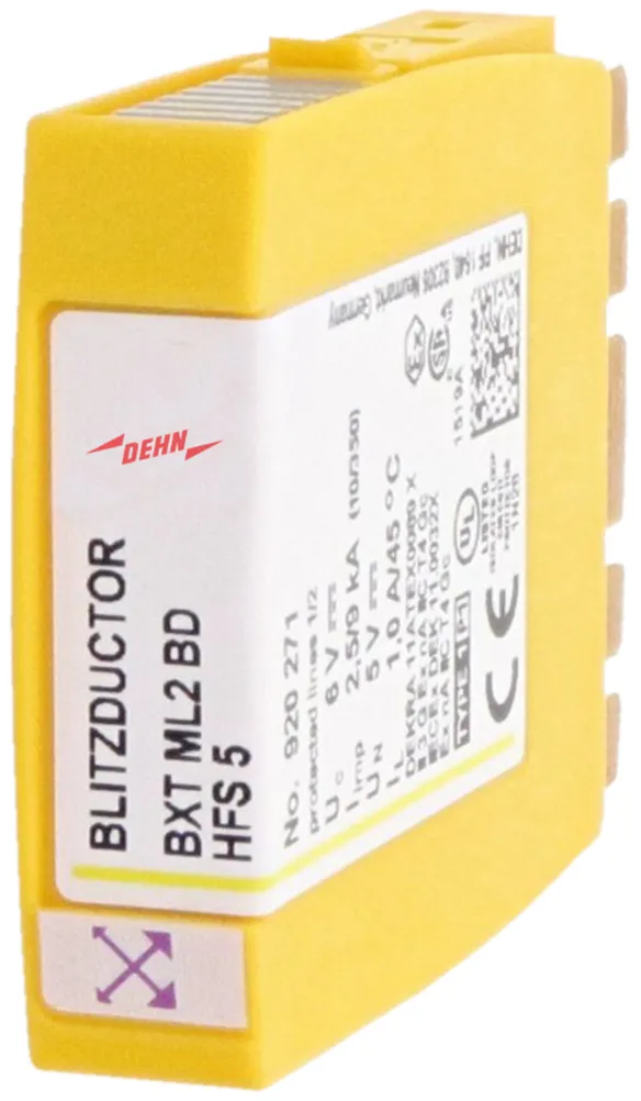 Kompaktní modul kombinovaného svodiče přepětí s technologií RFID-LifeCheck pro ochranu jednoho páru žil bezpotenciálového symetrického rozhraní. LifeCheck zaznamenává tepelné nebo elektrické přetížení svodiče, po kterém je třeba svodič vyměnit. Kontrola je prováděna bezdotykově prostřednictvím DEHNrecord LC / SCM / MCM.