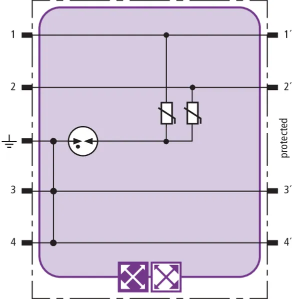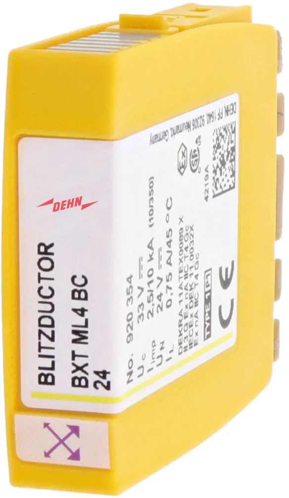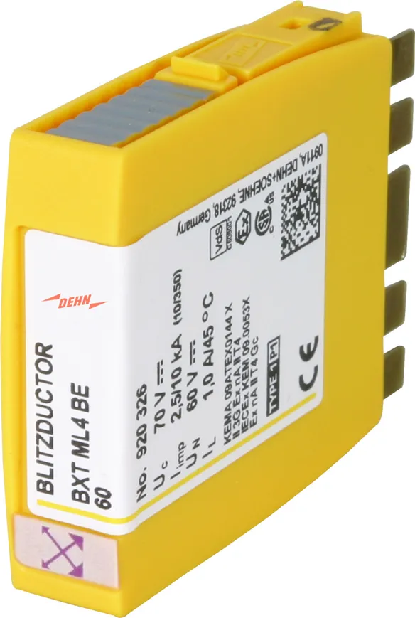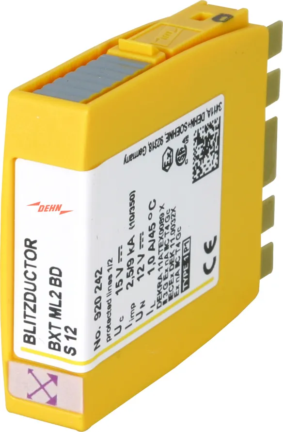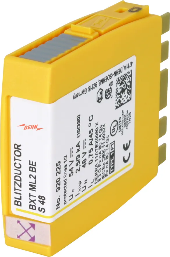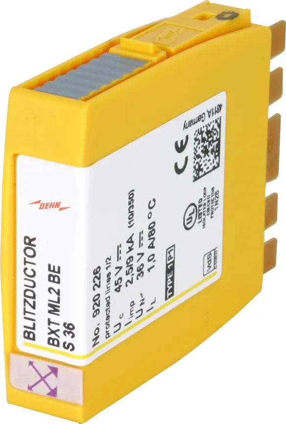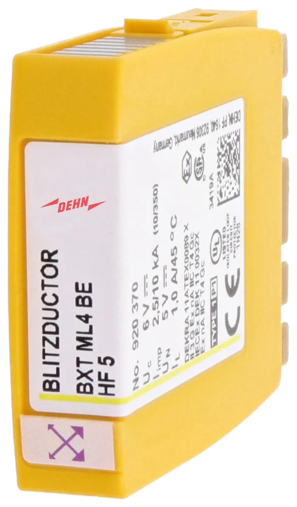 Kompaktní modul kombinovaného svodiče přepětí s technologií RFID-LifeCheck pro ochranu jednoho páru žil bezpotenciálového symetrického rozhraní. LifeCheck zaznamenává tepelné nebo elektrické přetížení svodiče, po kterém je třeba svodič vyměnit. Kontrola je prováděna bezdotykově prostřednictvím DEHNrecord LC / SCM / MCM.