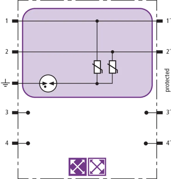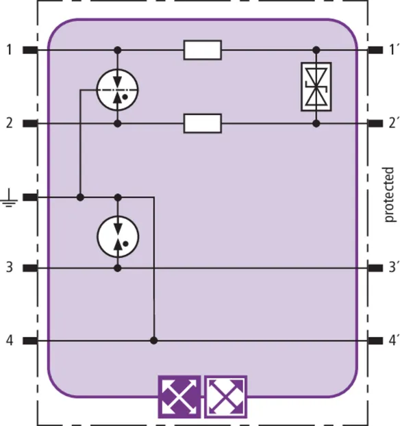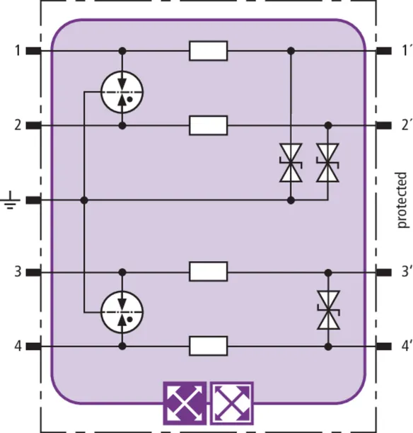Prostorově úsporný modul kombinovaného svodiče s čipem RFID-LifeCheck chrání 1 pár žil neuzemněného symetrického rozhraní, s možností volby přímého nebo nepřímého uzemnění stínění. LifeCheck zaznamenává tepelné nebo elektrické přetížení svodiče, po kterém je třeba svodič vyměnit. Kontrola je prováděna bezdotykově prostřednictvím přístrojů DEHNrecord LC / SCM / MCM.