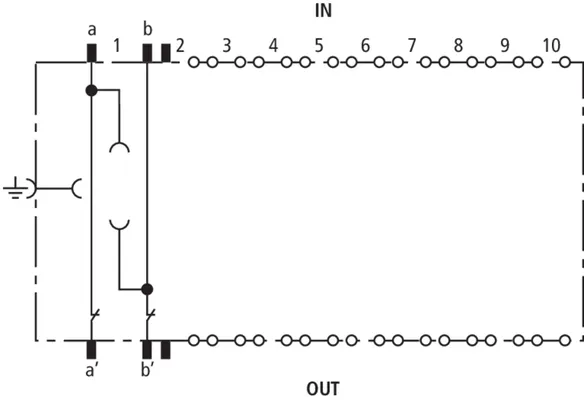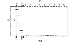 Zkratovací modul, zasunutý do uzemňovacího rámu EF 10 DRL, umožňuje snadné propojení dvou neosazených žil a jejich připojení k vyrovnání potenciálů. Toto opatření slouží k přímému uzemnění žil, které nejsou využité, ale jsou připojené k rozpojovací svorkovnici LSA. Uzemňovací modul není možno zasunout do bloku DRL 10 B...