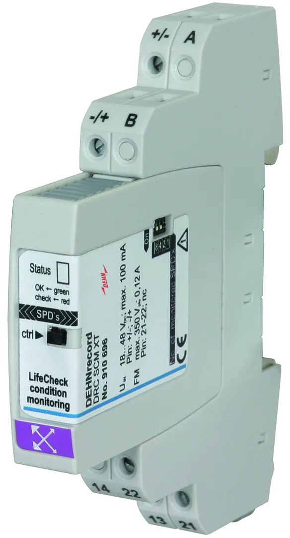 Přístroj pro instalaci na montážní lištu TS 35 monitoruje stav max. deseti svodičů BLITZDUCTOR XT/XTU s čipem RFID-LifeCheck. Optická signalizace stavu svodičů prostřednictvím tříbarevné LED diody kombinovaná s kontaktem dálkové signalizace (rozepínací nebo spínací kontakt). Prostřednictvím integrovaného rozhraní RS 485 může být dozorováno až 15 DRC MCM XT zapojených do jednoho systému se 150 svodiči BLITZDUCTOR XT/XTU.