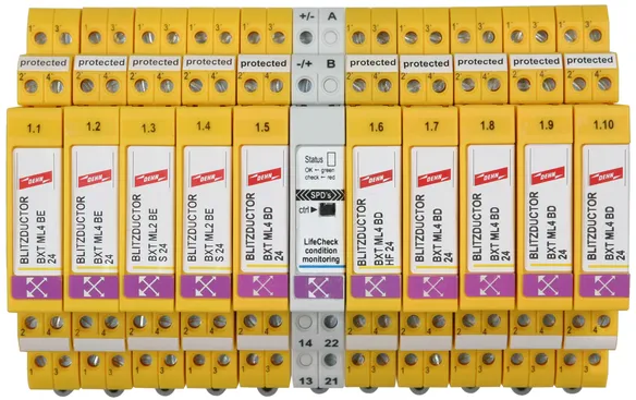 Přístroj pro instalaci na montážní lištu TS 35 monitoruje stav až deseti svodičů BLITZDUCTOR XT/XTU s čipem RFID-LifeCheck. Optická signalizace stavu svodičů prostřednictvím tříbarevné LED diody kombinovaná s kontaktem dálkové signalizace (rozepínací kontakt).