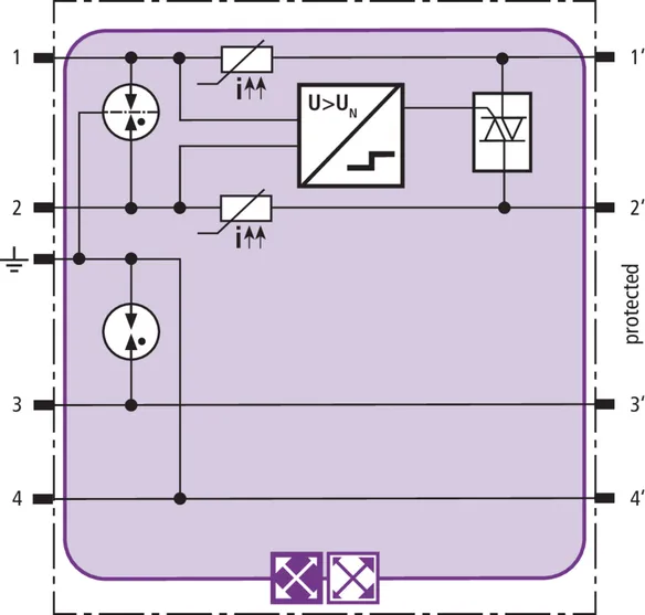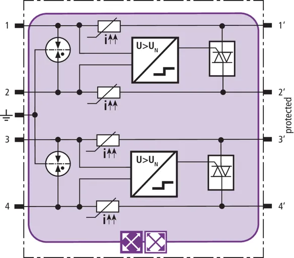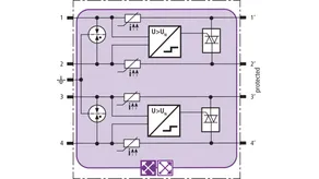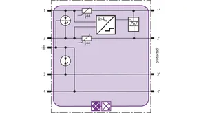 Prostorově úsporný modul kombinovaného svodiče s technologií actiVsense a čipem RFID-LifeCheck chrání 2 páry žil symetrických rozhraní s galvanickým oddělením. Vedení mohou mít stejné nebo rozdílné provozní napětí. Svodič automaticky rozpozná nosné provozní napětí signálu a nastaví podle něj optimální ochrannou úroveň.