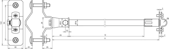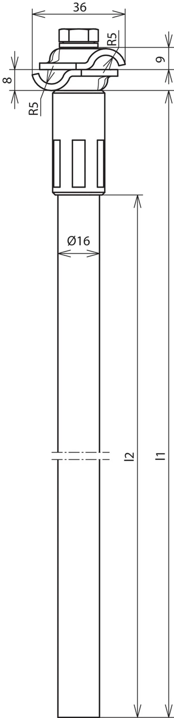 Distanční tyč z umělé hmoty vyztužené skleněnými vlákny GFK (glasfaserverstärkte Kunststoff), Ø 16 mm, odolné proti UV záření, barva světle šedá, teplota prostředí -50 až + 100 °C.