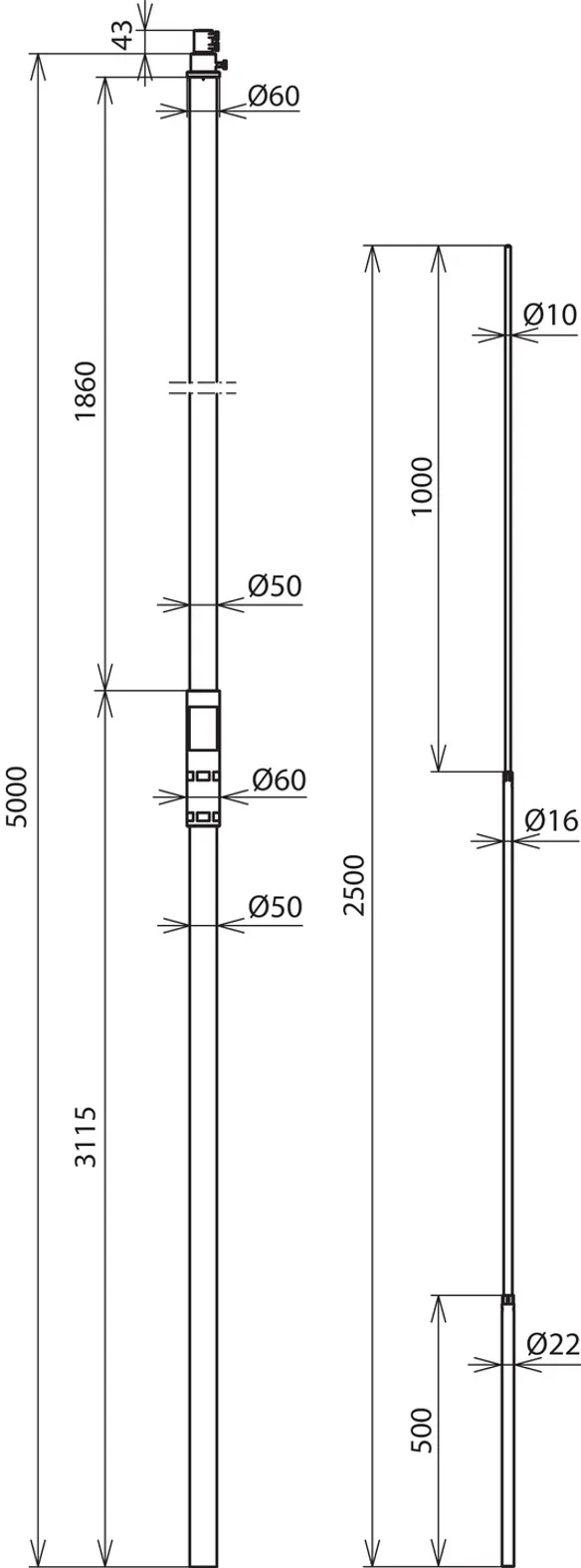 | Max. volná délka s jímací tyčí (montáž na stěnu) | 5000 mm |