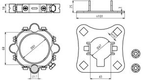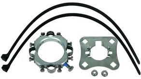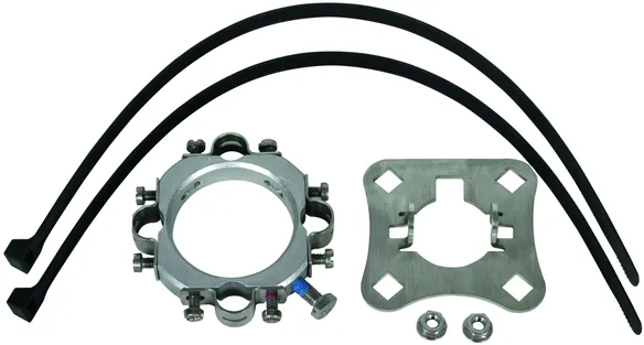 Upevňovací sada pro montáž vodiče HVI light k podpůrné trubce Ø 50 mm (např. podpůrná trubka HVI long), složená z připojovací destičky (čtyřnásobné s dvojicí přírubových matic s ozubením) a upevňovacího kroužku se čtyřmi držáky vedení (Ø 17 mm), opatřenými prořezem pro zajištění oblasti koncovky (včetně dvou stahovacích pásků).
