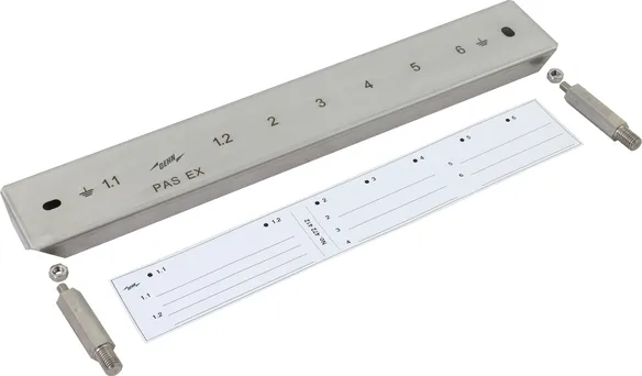 Adaptér pro jiskrově bezpečné přípojnice pro vyrovnání potenciálů PAS EX. Pro připojení pásku. Použití v prostředí s nebezpečím výbuchu Ex zóny 1 a 2 (plyny, páry, mlha) až do skupiny výbušnosti IIC a Ex zóny 21 a 22 (prach). Použití povoleno ve vnitřních a venkovních prostorách.