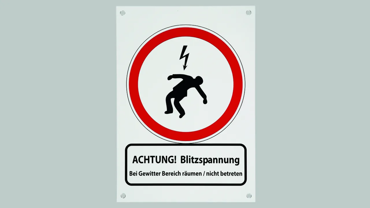 Výstražná tabulka pozor nebezpečí blesku Výstražná tabulka Potisk na přední straně v němčině: „ACHTUNG! Blitzspannung Bei Gewitter Bereich räumen / nicht betreten“ Potisk na zadní straně v angličtině: "ATTENTION! Lightning voltage Clear / do not enter this area during thunderstorms"