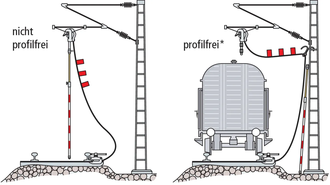 | *) Profilfreies Erden bedeutet, dass das Erdungsseil seitlich am Masten abhängbar ist und somit ein eingeschränkter Fahrbetrieb mit einer Diesellok ermöglicht wird. | |