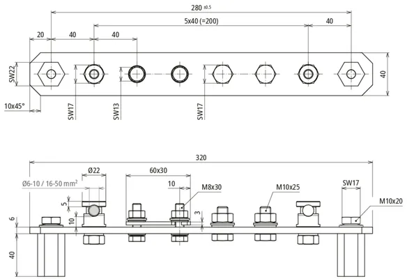 | Connections | 2x KS connector, 1x lug for 30-mm flat conductor, 2x M10 screw connection |