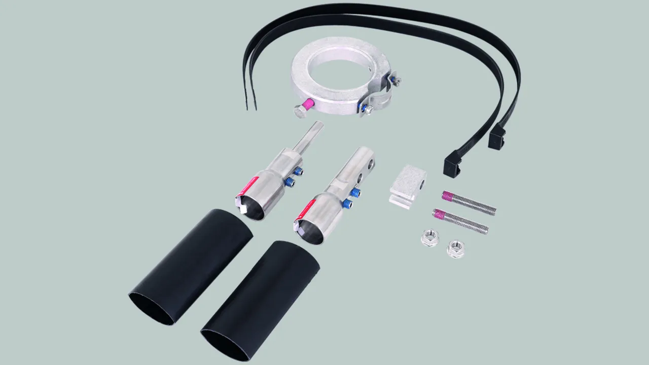 Connection kit for HVI power Conductor for installation on HVI power supporting tubes GRP / Al consisting of connection elements, threaded pins, connection part, heat-shrinkable sleeves, cable ties and fixing ring with a slotted conductor holder (Ø27 mm).