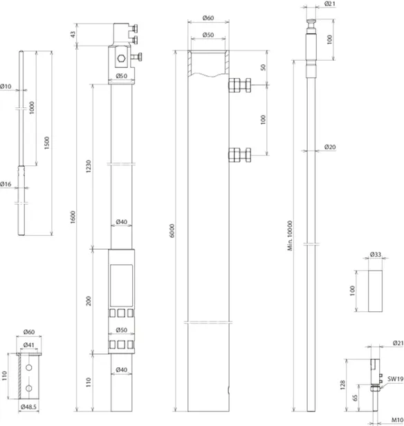 The separable air-termination mast / kit consists of: – Al air-termination rod, Ø16/10 mm, length 1500 mm – GRP/Al supporting tube, Ø40/50 mm, length 1600 mm – HDG steel (St/tZn) adapter, Ø40/50 mm – HDG steel (St/tZn) mast pipe, Ø60 mm, length 6000 mm (max. transport length) – HVI light plus Conductor (pre-assembled, installation inside the supporting tube)