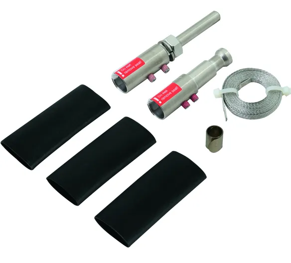 Connection kit for sealing the HVI light Conductor at both ends, for implementing the adjustment range of the conductor in the supporting tube (head piece) and connection element for other parts of the external lightning protection system or earth-termination system (incl. EB connection cable, constant force spring and three heat-shrinkable sleeves).